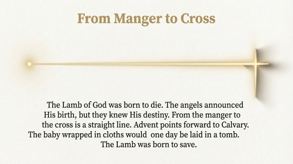 Advent points to the manger, but the manger points inexorably to the cross. The Lamb of God was born to die. Before the world was even made, the Lamb was "slain" in the heart of God (Revelation 13:8). Redemption was never Plan B. He walked willingly into suffering because He loved you. The finality of His sacrificial death paves the way for the ultimate victory of His resurrection.