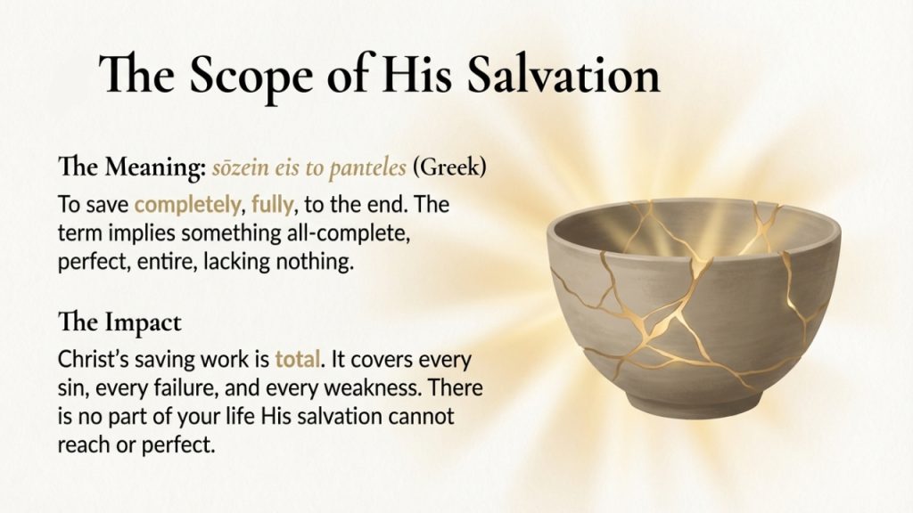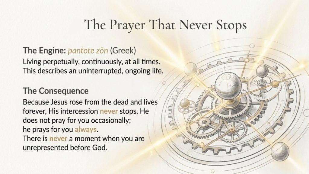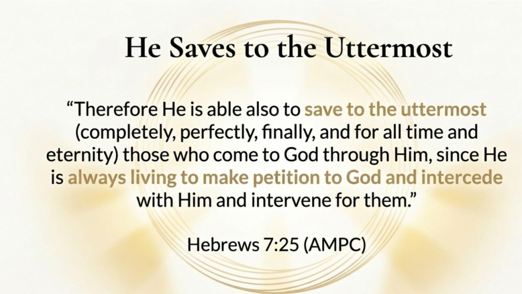 The book of Hebrews tells us that Jesus is "always living to make intercession." His prayer is not occasional; it is continuous. This ensures that He is able to "save to the uttermost"—completely, perfectly, and for all time. Your salvation is not fragile or dependent on your flawless performance; it is secured by His perfect, ongoing work. There is never a moment when you are unrepresented before the throne of God.